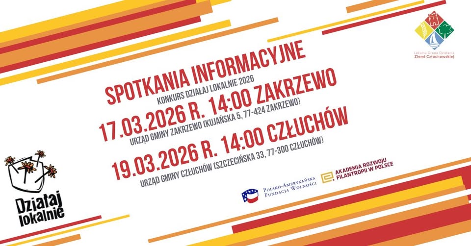 W imieniu Lokalnej Grupy działania Ziemi Człuchowskiej zapraszamy na spotkania informacyjne dotyczące tegorocznej edycji konkursu Działaj Lokalnie 2026. Jeśli masz pomysł na inicjatywę społeczną, chcesz działać na rzecz swojej miejscowości lub dowiedzieć się, jak zdobyć dofinansowanie – to spotkanie jest dla Ciebie!