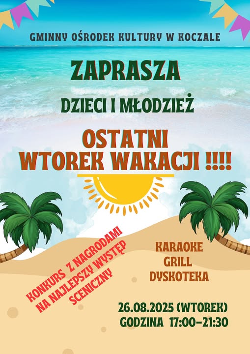 Wydarzenie adresowane jest zarówno do dzieci, jak i młodzieży. Odbędzie się ono we wtorek, 26 sierpnia, na placu przy Gminnym Ośrodku Kultury w Koczale. – Startujemy o godzinie 17:30. Będzie karaoke, które poprowadzi pani Milena, animacje taneczne z panią Olą oraz dyskoteka, którą poprowadzi osobiście dyrektor GOK-u. Będzie także grill i inne niespodzianki. Ostatni wtorek wakacji. Przybywajcie! – zachęca Artur Radecki, dyrektor Gminnego Ośrodka Kultury w Koczale. Udział w wydarzeniu jest bezpłatny. Jest to impreza otwarta zarówno dla dzieci z gminy Koczała, jak i gości przebywających u nas na wakacjach.