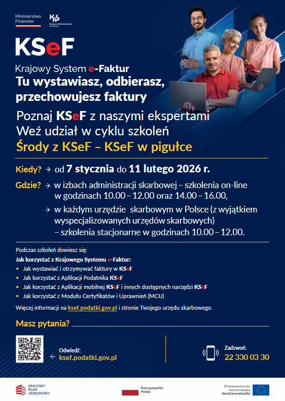 W związku z wdrożeniem od 1 lutego 2026 roku Krajowego Systemu e-Faktur (KSeF) – reforma wprowadzająca jednolity sposób wystawiania, odbierania i przechowywania faktur, informujemy m.in. o cyklu szkoleń stacjonarnych w Urzędzie Skarbowym w Człuchowie, które odbywać się będą w każdą środę, od 7 stycznia 2026 roku do 11 lutego 2026 roku w godzinach od 10.00 – 12.00 „Środy z KSeF – KSeF w pigułce” oraz o dniu otwartym w Urzędzie Skarbowym w Człuchowie 24 stycznia 2026 roku (sobota) „Dzień otwarty z KSeF”.