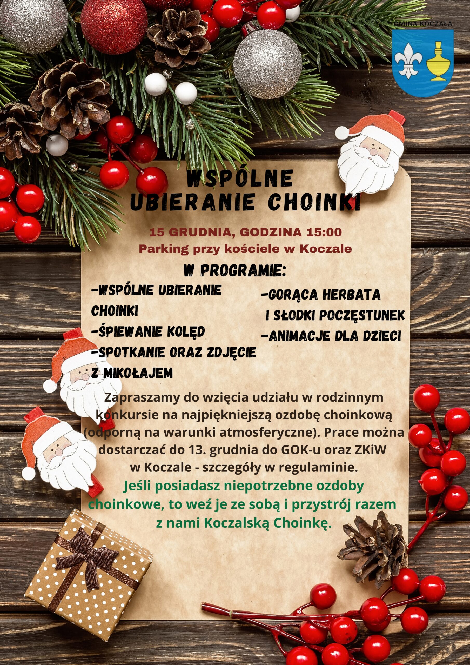 Mieszkańcy:http://badania.corigo.pl/ankieta/1074101/koczala-diagnoza-zjawiska-przemocy-mieszkancy.htmlUczniowie: Nie tylko maluchy, ale też dorośli otrzymywali drobne upominki od Świętego Mikołaja. Ten niezwykły gość 6 grudnia przyjechał do Koczały. W towarzystwie swojego barwnego orszaku odwiedzał on różne miejsca. Na początku zawitał... Trzy strażackie remizy zostały wpisane do programu remontu remiz OSP w Gminie Koczała. Prace będą prowadzone w Koczale, Pietrzykowie i Starznie. Samorząd otrzymał na ten cel 2,5 mln złotych... W ramach tegorocznego naboru „FLOREK – wsparcie dla OSP” (edycja 2023) nasza jednostka OSP Pietrzykowo zrealizowała zadanie pn. „Podniesienie gotowości bojowej OSP poprzez doposażenie jednostki w niezbędny... Ponad 11 tysięcy złotych zebrano podczas tegorocznej edycji Jarmarku Zimowego w Szkole Podstawowej w Koczale. Pieniądze trafią na konto Rady Rodziców. Wspomogą one w przyszłości akcje organizowane dla... Zapraszamy wszystkich mieszkańców Gminy Koczała na wspólne ubieranie choinki, które odbędzie się 15 grudnia 2023 r. o godzinie 15:00 na parkingu przy kościele w Koczale. To pierwsze takie wydarzenie w naszej... Od 1 do 22 grudnia 2023 r. na terenie całej Polski zostaną przeprowadzone badania statystyczne z zakresu rolnictwa: 6 grudnia to dzień, w którym Święty Mikołaj odwiedza wszystkie dzieci. W swojej podróży nie ominie on też Koczały. Należy go wypatrywać już od wczesnych godzin porannych. – Mamy informacje, że Święty Mikołaj... Na razie są próbną drużyną harcerską. Docelowo chcą zostać pełnoprawną drużyną wielopoziomową. Taką nazwę, zgodnie z harcerską nomenklaturą, będzie miała nowo tworzona grupa harcerzy z Koczały. Formacja ma już...